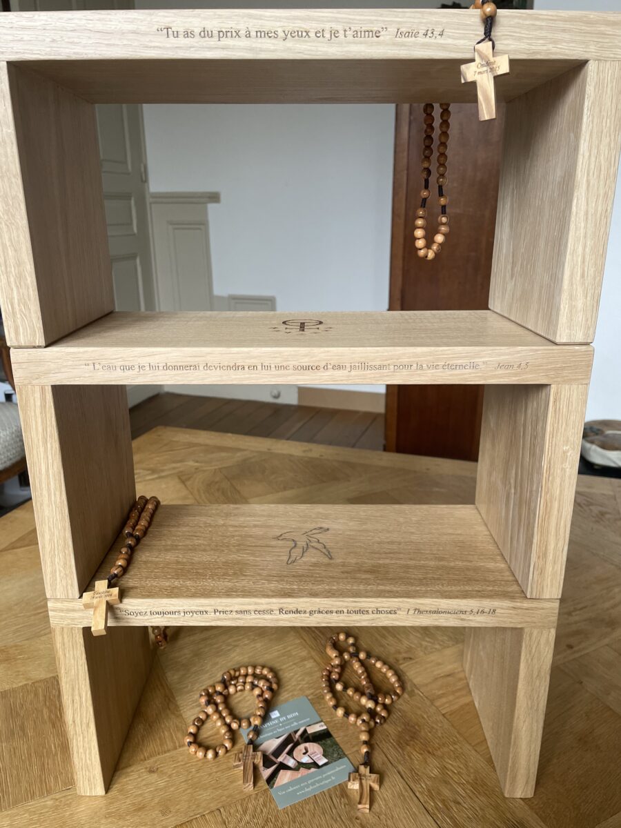 Dans une chambre, le salon ou au pied du coin prière, ce banc de prière en chêne, gravé au prénom des fiancés, des mariés, de l’enfant, avec la date de sa première communion, de sa Profession de Foi, de sa Confirmation, et éventuellement un verset biblique, invite au recueillement.