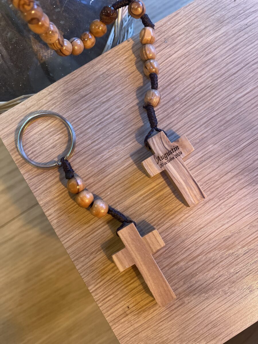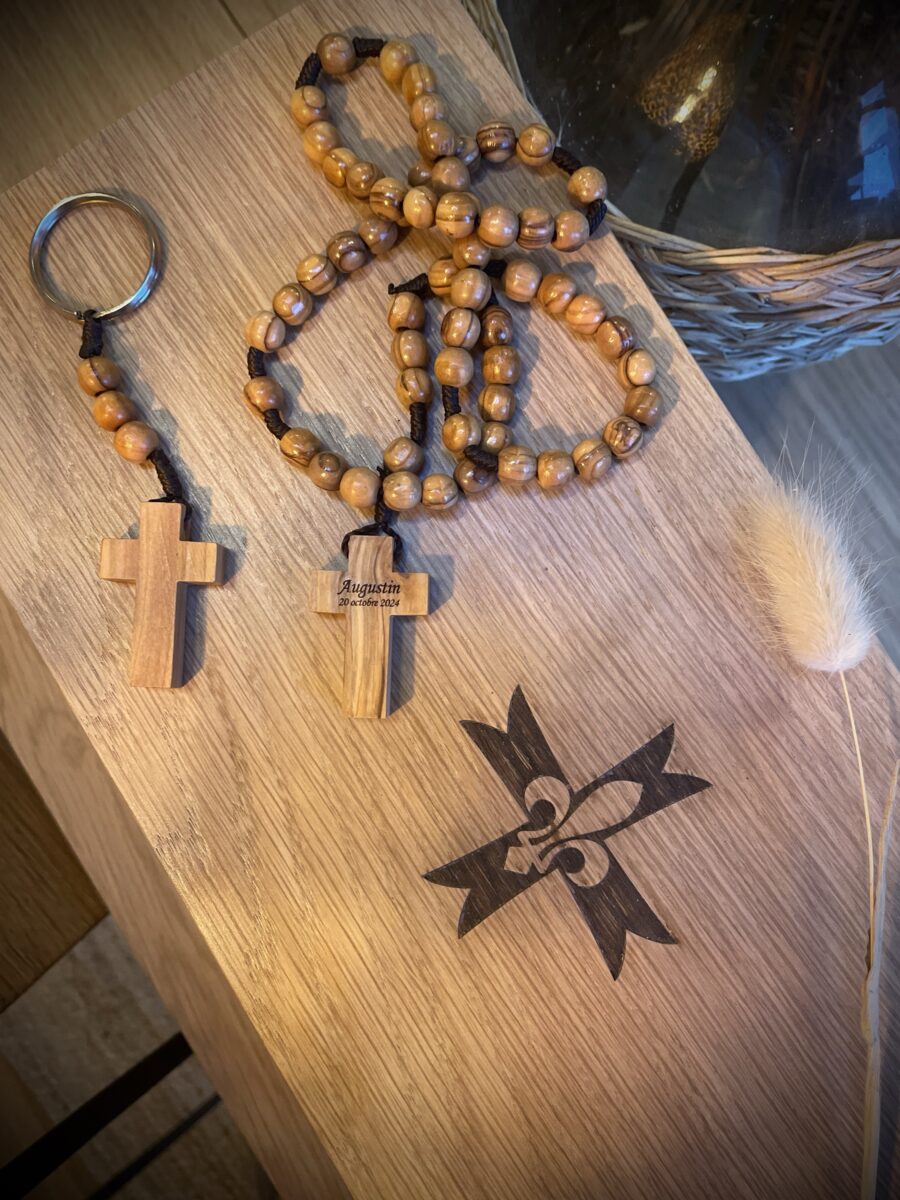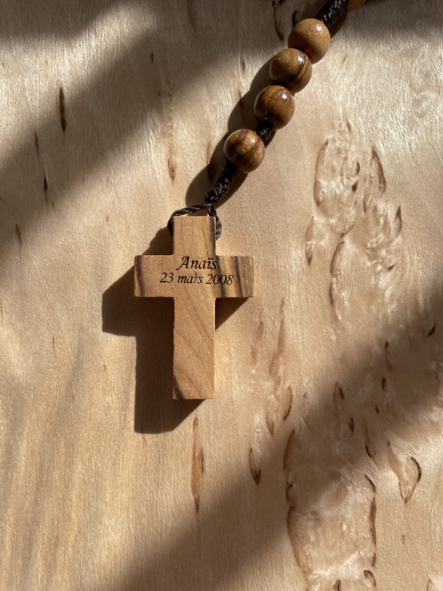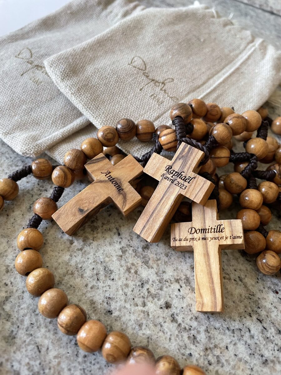 Ils sont personnalisables avec ou sans gravure, les gravures consistant en une croix (6 choix de croix ou 1 colombe), le prénom, une date et/ou un verset de la Bible. Les noms des croix sont indiqués sur les photos pour vous aider dans votre choix. Le cadeau idéal pour vos enfants et petits-enfants.